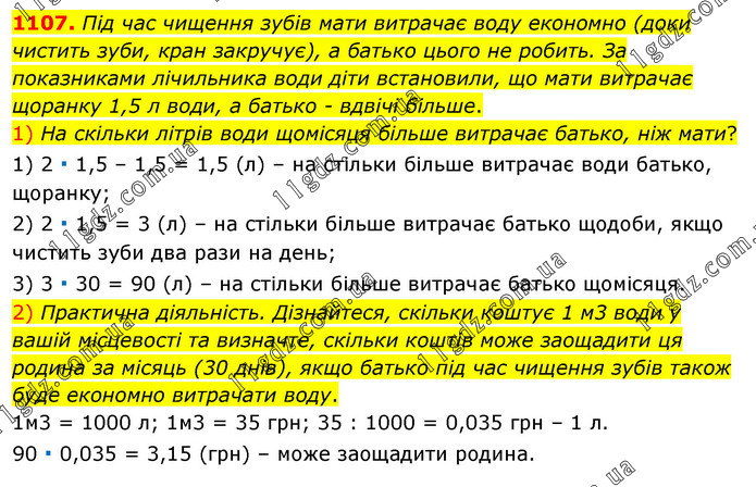 Під час чищення зубів мати витрачає воду економно (доки чистить зуби, кран закручує), а батько цього не робить. За показниками лічильника води діти встановили, що мати витрачає щоранку 1,5 л води, а батько - вдвічі більше. 1) На скільки літрів води щомісяця більше витрачає батько, ніж мати? 1) 2 ∙ 1,5 – 1,5 = 1,5 (л) – на стільки більше витрачає води батько, щоранку; 2) 2 ∙ 1,5 = 3 (л) – на стільки більше витрачає батько щодоби, якщо чистить зуби два рази на день; 3) 3 ∙ 30 = 90 (л) – на стільки більше витрачає батько щомісяця. 2) Практична діяльність. Дізнайтеся, скільки коштує 1 м3 води у вашій місцевості та визначте, скільки коштів може заощадити ця родина за місяць (30 днів), якщо батько під час чищення зубів також буде економно витрачати воду. 1м3 = 1000 л; 1м3 = 35 грн; 35 : 1000 = 0,035 грн – 1 л. 90 ∙ 0,035 = 3,15 (грн) – може заощадити родина.