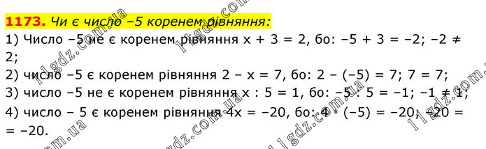 Чи є число –5 коренем рівняння: 1) Число –5 не є коренем рівняння х + 3 = 2, бо: –5 + 3 = –2; –2 ≠ 2; 2) число –5 є коренем рівняння 2 – х = 7, бо: 2 – (–5) = 7; 7 = 7; 3) число –5 не є коренем рівняння х : 5 = 1, бо: –5 : 5 = –1; –1 ≠ 1; 4) число – 5 є коренем рівняння 4х = –20, бо: 4 ∙ (–5) = –20; –20 = = –20.