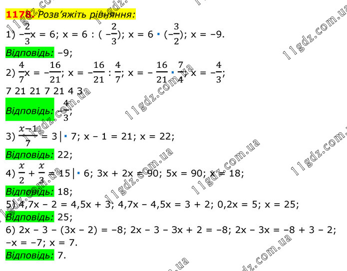 Розв’яжіть рівняння: 1) –2/3x = 6; x = 6 : ( –2/3); x = 6 ∙ (–3/2); x = –9. Відповідь: –9; 2) 4/7х = –16/21; х = –16/21 : 4/7; х = – 16/21 ∙ 7/4; х = –4/3; 7 21 21 7 21 4 З Відповідь: –4/3; 3) (x-1)/7 = 3│∙ 7; х – 1 = 21; х = 22; Відповідь: 22; 4) x/2 + x/3 = 15│∙ 6; 3х + 2х = 90; 5х = 90; х = 18; Відповідь: 18; 5) 4,7x – 2 = 4,5x + 3; 4,7x – 4,5х = 3 + 2; 0,2х = 5; х = 25; Відповідь: 25; 6) 2х – 3 – (3х – 2) = –8; 2х – 3 – Зх + 2 = –8; 2х – 3х = –8 + 3 – 2; –х = –7; х = 7. Відповідь: 7.