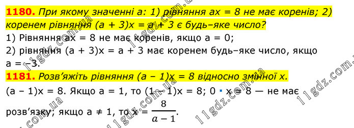 1180. При якому значенні а: 1) рівняння ах = 8 не має коренів; 2) коренем рівняння (а + 3)x = а + 3 є будь–яке число? 1) Рівняння ах = 8 не має коренів, якщо а = 0; 2) рівняння (а + 3)х = а + 3 має коренем будь–яке число, якщо а = –3. 1181. Розв’яжіть рівняння (а – 1)x = 8 відносно змінної x. (a – 1)x = 8. Якщо а = 1, то (1 – 1)х = 8; 0 ∙ х = 8 — не має розв’язку; якщо а ≠ 1, то х = 8/(a - 1).