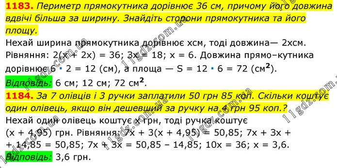1183. Периметр прямокутника дорівнює 36 см, причому його довжина вдвічі більша за ширину. Знайдіть сторони прямокутника та його площу. Нехай ширина прямокутника дорівнює хсм, тоді довжина— 2хсм. Рівняння: 2(х + 2х) = 36; Зх = 18; х = 6. Довжина прямо–кутника дорівнює 6 ∙ 2 = 12 (см), а площа — S = 12 ∙ 6 = 72 (см2). Відповідь: 6 см; 12 см; 72 см2. 1184. За 7 олівців і 3 ручки заплатили 50 грн 85 коп. Скільки коштує один олівець, якщо він дешевший за ручку на 4 грн 95 коп.? Нехай один олівець коштує х грн, тоді ручка коштує (х + 4,95) грн. Рівняння: 7х + 3(х + 4,95) = 50,85; 7x + Зх + + 14,85 = 50,85; 7х + Зх = 50,85 – 14,85; 10x = 36; x = 3,6. Відповідь: 3,6 грн.
