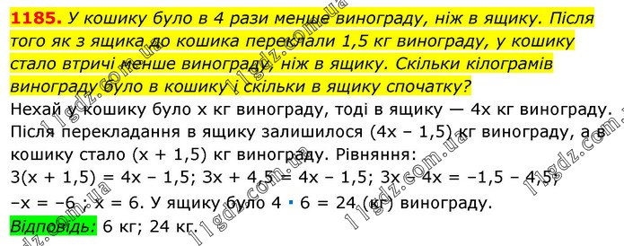 У кошику було в 4 рази менше винограду, ніж в ящику. Після того як з ящика до кошика переклали 1,5 кг винограду, у кошику стало втричі менше винограду, ніж в ящику. Скільки кілограмів винограду було в кошику і скільки в ящику спочатку? Нехай у кошику було х кг винограду, тоді в ящику — 4х кг винограду. Після перекладання в ящику залишилося (4х – 1,5) кг винограду, а в кошику стало (x + 1,5) кг винограду. Рівняння: 3(x + 1,5) = 4х – 1,5; Зх + 4,5 = 4х – 1,5; 3х – 4х = –1,5 – 4,5; –х = –6 ; х = 6. У ящику було 4 ∙ 6 = 24 (кг) винограду. Відповідь: 6 кг; 24 кг.