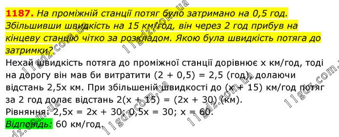 На проміжній станції потяг було затримано на 0,5 год. Збільшивши швидкість на 15 км/год, він через 2 год прибув на кінцеву станцію чітко за розкладом. Якою була швидкість потяга до затримки? Нехай швидкість потяга до проміжної станції дорівнює х км/год, тоді на дорогу він мав би витратити (2 + 0,5) = 2,5 (год), долаючи відстань 2,5х км. При збільшеній швидкості до (х + 15) км/год потяг за 2 год долає відстань 2(х + 15) = (2х + 30) (км). Рівняння: 2,5х = 2х + 30; 0,5х = 30; х = 60. Відповідь: 60 км/год.