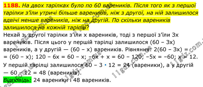 На двох тарілках було по 60 вареників. Після того як з першої тарілки з’їли утричі більше вареників, ніж з другої, на ній залишилося вдвічі менше вареників, ніж на другій. По скільки вареників залишилося на кожній тарілці? Нехай з, другої тарілки з’їли х вареників, тоді з першої з’їли Зх вареників. Після цього у першій тарілці залишилося (60 – Зх) вареників, а у другій — (60 – х) вареників. Рівняння: 2(60 – Зх) = = (60 – х); 120 – 6х = 60 – х; –6х + х = 60 – 120; –5х = –60; х = 12. У першій тарілці залишилося 60 – 3 ∙ 12 = 24 (вареники), а у другій — 60 – 12 = 48 (вареників). Відповідь: 24 вареники і 48 вареників.
