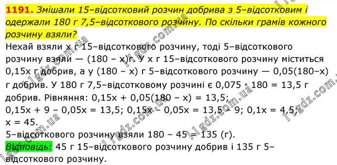 Змішали 15–відсотковий розчин добрива з 5–відсотковим і одержали 180 г 7,5–відсоткового розчину. По скільки грамів кожного розчину взяли? Нехай взяли х г 15–відсоткового розчину, тоді 5–відсоткового розчину взяли — (180 – х)г. У х г 15–відсоткового розчину міститься 0,15х г добрив, а у (180 – х) г 5–відсоткового розчину — 0,05(180–х) г добрив. У 180 г 7,5–відсотковому розчині є 0,075 ∙ 180 = 13,5 г добрив. Рівняння: 0,15х + 0,05(180 – х) = 13,5; 0,15х + 9 – 0,05х = 13,5; 0,15х – 0,05х = 13,5 – 9; 0,1х = 4,5; х = 45. 5–відсоткового розчину взяли 180 – 45 = 135 (г). Відповідь: 45 г 15–відсоткового розчину добрив і 135 г 5–відсоткового розчину.