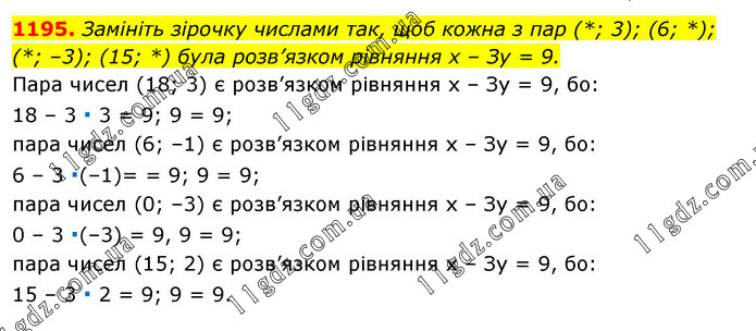 Замініть зірочку числами так, щоб кожна з пар (*; 3); (6; *); (*; –3); (15; *) була розв’язком рівняння х – Зу = 9. Пара чисел (18; 3) є розв’язком рівняння х – Зу = 9, бо: 18 – 3 ∙ 3 = 9; 9 = 9; пара чисел (6; –1) є розв’язком рівняння х – Зу = 9, бо: 6 – 3 ∙(–1)= = 9; 9 = 9; пара чисел (0; –3) є розв’язком рівняння х – Зу = 9, бо: 0 – 3 ∙(–3) = 9, 9 = 9; пара чисел (15; 2) є розв’язком рівняння х – Зу = 9, бо: 15 – 3 ∙ 2 = 9; 9 = 9.