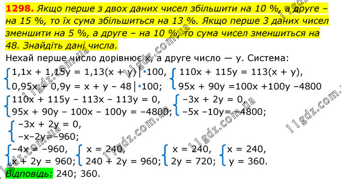 Якщо перше з двох даних чисел збільшити на 10 %, а друге – на 15 %, то їх сума збільшиться на 13 %. Якщо перше 3 даних чисел зменшити на 5 %, а друге – на 10 %, то сума чисел зменшиться на 48. Знайдіть дані числа.