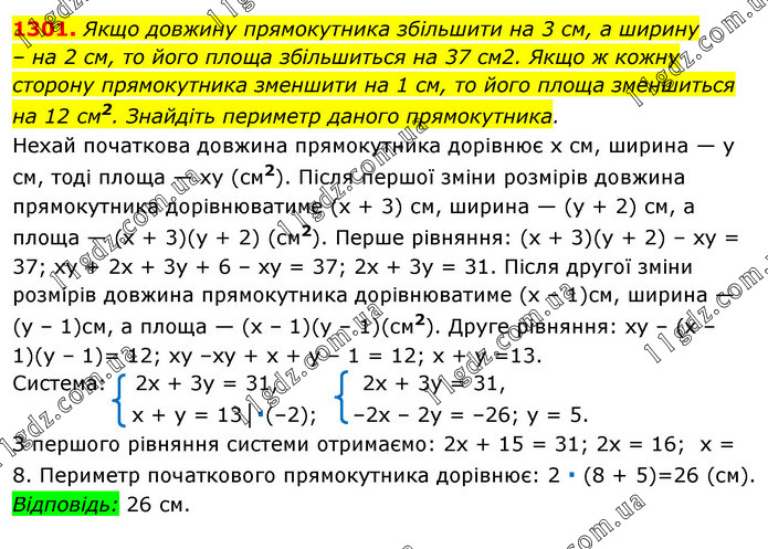 Якщо довжину прямокутника збільшити на 3 см, а ширину – на 2 см, то його площа збільшиться на 37 см2. Якщо ж кожну сторону прямокутника зменшити на 1 см, то його площа зменшиться на 12 см2. Знайдіть периметр даного прямокутника. Нехай початкова довжина прямокутника дорівнює х см, ширина — y см, тоді площа — ху (см2). Після першої зміни розмірів довжина прямокутника дорівнюватиме (х + 3) см, ширина — (у + 2) см, а площа — (х + 3)(у + 2) (см2). Перше рівняння: (х + 3)(y + 2) – xу = 37; xy + 2х + 3y + 6 – хy = 37; 2х + 3y = 31. Після другої зміни розмірів довжина прямокутника дорівнюватиме (х – 1)см, ширина — (у – 1)см, а площа — (х – 1)(y – 1)(см2). Друге рівняння: ху – (х – 1)(у – 1)= 12; ху –ху + х + у – 1 = 12; х + y =13.