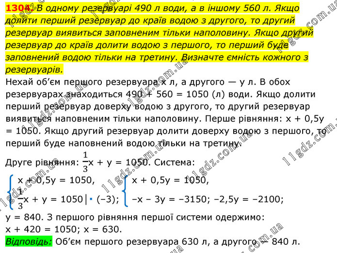 В одному резервуарі 490 л води, а в іншому 560 л. Якщо долити перший резервуар до країв водою з другого, то другий резервуар виявиться заповненим тільки наполовину. Якщо другий резервуар до країв долити водою з першого, то перший буде заповнений водою тільки на третину. Визначте ємність кожного з резервуарів. Нехай об’єм першого резервуара х л, а другого — y л. В обох резервуарах знаходиться 490 + 560 = 1050 (л) води. Якщо долити перший резервуар доверху водою з другого, то другий резервуар виявиться наповненим тільки наполовину. Перше рівняння: х + 0,5y = 1050. Якщо другий резервуар долити доверху водою з першого, то перший буде наповнений водою тільки на третину. Друге рівняння: 1/3x + y = 1050. Система: