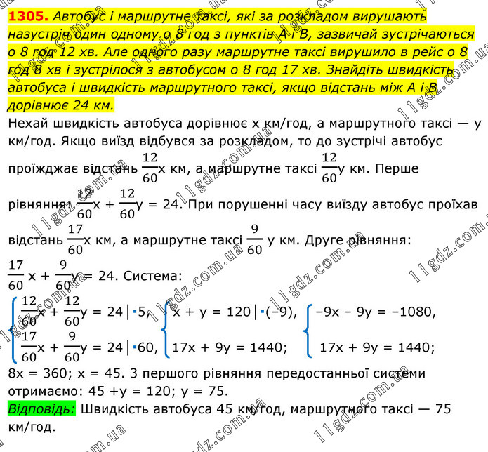 Автобус і маршрутне таксі, які за розкладом вирушають назустріч один одному о 8 год з пунктів A i В, зазвичай зустрічаються о 8 год 12 хв. Але одного разу маршрутне таксі вирушило в рейс о 8 год 8 хв і зустрілося з автобусом о 8 год 17 хв. Знайдіть швидкість автобуса і швидкість маршрутного таксі, якщо відстань між A i B дорівнює 24 км. Нехай швидкість автобуса дорівнює х км/год, а маршрутного таксі — у км/год. Якщо виїзд відбувся за розкладом, то до зустрічі автобус проїжджає відстань 12/60х км, а маршрутне таксі 12/60у км. Перше рівняння: 12/60х + 12/60y = 24. При порушенні часу виїзду автобус проїхав відстань 17/60х км, а маршрутне таксі 9/60 у км. Друге рівняння: 17/60 х + 9/60y = 24. Система: