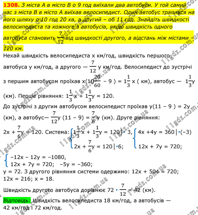 З міста А в місто В о 9 год виїхали два автобуси. У той самий час з міста В в місто А виїхав велосипедист. Один автобус трапився на його шляху о 10 год 20 хв, а другий – об 11 год. Знайдіть швидкості велосипедиста та кожного з автобусів, якщо швидкість одного автобуса становить 7/12 від швидкості другого, а відстань між містами – 120 км. Нехай швидкість велосипедиста х км/год, швидкість першого автобуса у км/год, а другого — 7/12 у км/год. Велосипедист до зустрічі з першим автобусом проїхав х(1020/60 – 9 ) = 11/3 х ( км), автобус — 11/3у (км). Перше рівняння: 11/3 x + 11/3y = 120. До зустрічі з другим автобусом велосипедист проїхав у(11 – 9 ) = 2у (км), а автобус— 7/12у (11 – 9) = 7/6 у (км). Друге рівняння: