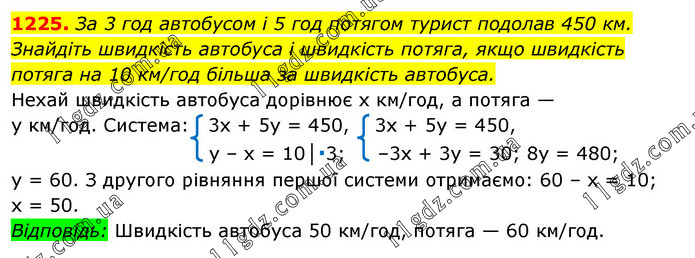 За 3 год автобусом і 5 год потягом турист подолав 450 км. Знайдіть швидкість автобуса і швидкість потяга, якщо швидкість потяга на 10 км/год більша за швидкість автобуса.