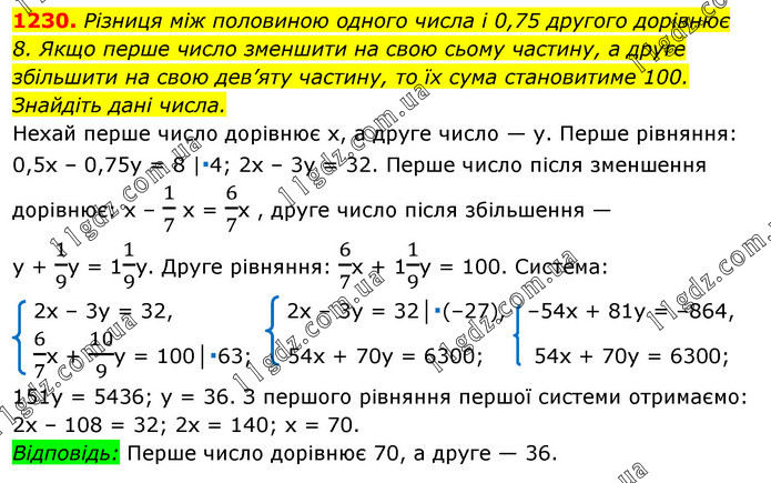 Різниця між половиною одного числа і 0,75 другого дорівнює 8. Якщо перше число зменшити на свою сьому частину, а друге збільшити на свою дев’яту частину, то їх сума становитиме 100. Знайдіть дані числа.
