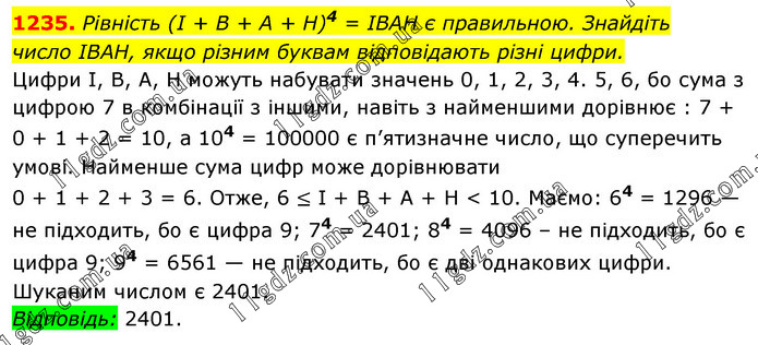 Рівність (І + В + А + H)4 = ІВАН є правильною. Знайдіть число ІВАН, якщо різним буквам відповідають різні цифри. Цифри І, В, A, H можуть набувати значень 0, 1, 2, 3, 4. 5, 6, бо сума з цифрою 7 в комбінації з іншими, навіть з найменшими дорівнює : 7 + 0 + 1 + 2 = 10, а 104 = 100000 є п’ятизначне число, що суперечить умові. Найменше сума цифр може дорівнювати 0 + 1 + 2 + 3 = 6. Отже, 6 ≤ І + В + А + Н < 10. Маємо: 64 = 1296 — не підходить, бо є цифра 9; 74 = 2401; 84 = 4096 – не підходить, бо є цифра 9; 94 = 6561 — не підходить, бо є дві однакових цифри. Шуканим числом є 2401. Відповідь: 2401.