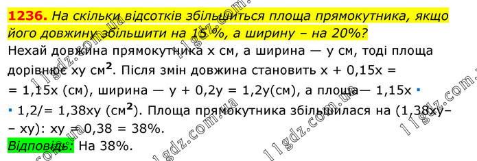 На скільки відсотків збільшиться площа прямокутника, якщо його довжину збільшити на 15 %, а ширину – на 20%? Нехай довжина прямокутника х см, а ширина — y см, тоді площа дорівнює ху см2. Після змін довжина становить х + 0,15х = = 1,15х (см), ширина — y + 0,2y = 1,2y(см), а площа— 1,15х ∙ ∙ 1,2/= 1,38xy (см2). Площа прямокутника збільшилася на (1,38хy– – хy): ху = 0,38 = 38%. Відповідь: На 38%.