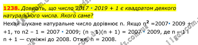 Доведіть, що число 2017 ∙ 2019 + 1 є квадратом деякого натурального числа. Якого саме? Нехай шукане натуральне число дорівнює n. Якщо n2 =2007∙ 2009 + +1, то n2 – 1 = 2007 ∙ 2009; (n – 1)(n + 1) = 2007 ∙ 2009, де n – 1 і n + 1 — суміжні до 2008. Отже, n = 2008.