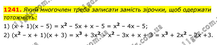 Який многочлен треба записати замість зірочки, щоб одержати тотожність: 1) (х + 1)(х – 5) = x2 – 5х + х – 5 = x2 – 4х – 5; 2) (x2 – х + 1)(х + 3) = x3 + Зх2 – x2 – Зх + х + З = х3 + 2x2 – 2х +3.