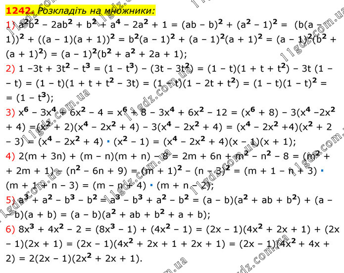 Розкладіть на множники: 1) а2b2 – 2аb2 + b2 + а4 – 2a2 + 1 = (ab – b)2 + (а2 – 1)2 = (b(а – 1))2 + ((а – 1)(a + 1))2 = b2(а – 1)2 + (а – 1)2(а + 1)2 = (а – 1)2(b2 + (а + 1)2) = (a – 1)2(b2 + a2 + 2a + 1); 2) 1 –3t + 3t2 – t3 = (1 – t3) – (3t – 3t2) = (1 – t)(1 + t + t2) – 3t (1 – – t) = (1 – t)(1 + t + t2 – 3t) = (1 – t)(1 – 2t + t2) = (1 – t)(1 – t)2 = = (1 – t3); 3) x6 – Зх4 + 6х2 – 4 = x6 + 8 – 3х4 + 6х2 – 12 = (х6 + 8) – 3(х4 –2x2 + 4) =(х2 + 2)(х4 – 2х2 + 4) – 3(х4 – 2х2 + 4) = (х4 – 2х2 +4)(х2 + 2 – 3) = (х4 – 2х2 + 4) ∙ (х2 – 1) = (х4 – 2х2 + 4)(х – 1)(х + 1); 4) 2(m + 3n) + (m – n)(m + n) – 8 = 2m + 6n + m2 – n2 – 8 = (m2 + + 2m + 1) – (n2 – 6n + 9) = (m + 1)2 – (n – З)2 = (m + 1 – n + 3) ∙ (m + 1 + n – 3) = (m – n + 4) ∙ (m + n – 2); 5) a3 + a2 – b3 – b2 = a3 – b3 + a2 – b2 = (a – b)(a2 + ab + b2) + (a – – b)(a + b) = (a – b)(a2 + ab + b2 + a + b); 6) 8x3 + 4x2 – 2 = (8x3 – 1) + (4x2 – 1) = (2x – 1)(4x2 + 2x + 1) + (2x – 1)(2x + 1) = (2x – 1)(4x2 + 2x + 1 + 2x + 1) = (2x – 1)(4x2 + 4x + 2) = 2(2x – 1)(2x2 + 2x + 1).