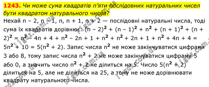 Чи може сума квадратів п’яти послідовних натуральних чисел бути квадратом натурального числа? Нехай n – 2, n – 1, n, n + 1, n + 2 — послідовні натуральні числа, тоді сума їх квадратів дорівнює: (n – 2)2 + (n – 1)2 + n2 + (n + 1)2 + (n + 2)2 = n2 – 4n + 4 + n2 – 2n + 1 + n2 + n2 + 2n + 1 + n2 + 4n + 4 = 5n2 + 10 = 5(n2 + 2). Запис числа n2 не може закінчуватися цифрами 3 або 8, тому запис числа n2 + 2 не може закінчуватися цифрами 5 або 0, а значить число n2 + 2 не ділиться на 5. Число 5(n2 + 2) ділиться на 5, але не ділиться на 25, а тому не може дорівнювати квадрату натурального числа.