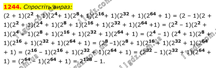 Спростіть вираз: (2 + 1)(22 + 1)(24+ 1)(28+ 1)(216+ 1)(232 + 1)(264 + 1) = (2 – 1)(2 + 1)(22 + 1)(24 + 1)(28 + 1)(216 + 1)(232 + 1)(264 +1) = (22 – 1)(22 + 1)(24 + 1)(28 + 1)(216 + 1)(232 + 1)(264 + 1) = (24 – 1) (24 + 1)(28 + 1)(216 + 1)(232 + 1)(264 + 1) = (28 –1)(28 + 1)(216 + 1)(232 + 1)(264 + 1) = (216 – 1)(216 + 1)(232 + 1)(264 + 1) = (232 – 1)(232 + 1)(264 + 1) = (264 – 1)(264 + 1) = 2128 – 1.