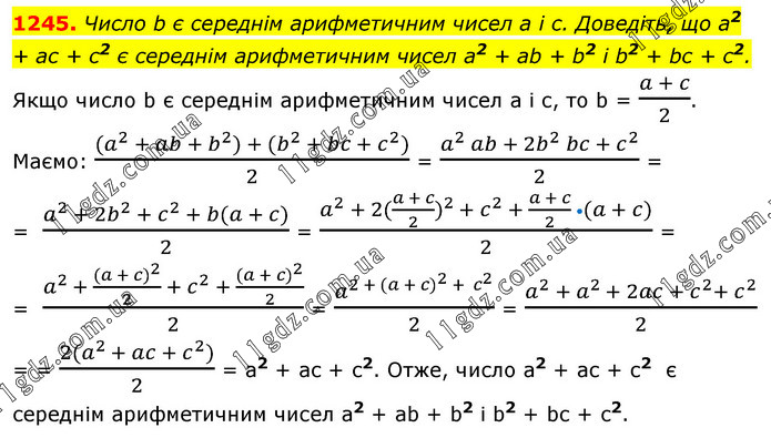 Число b є середнім арифметичним чисел а і с. Доведіть, що а2 + ас + с2 є середнім арифметичним чисел а2 + ab + b2 і b2 + bс + с2. Якщо число b є середнім арифметичним чисел а і с, то b = (a + c)/2. Маємо: (〖(a〗^2 + ab + b^2) + (b^2 + bc + c^2))/2 = (a^2 ab + 2b^2 bc + c^2)/2 = = (a^2 + 2b^2 + c^2 + b(a + c))/2 = (a^2 + 2((a + c)/2 )^(2 )+ c^2 + (a + c)/2 •(a + c))/2 = = (a^(2 )+ ((a + c)^2)/2 + c^2 + ((a + c)^2)/2)/2 = a^(2 + (a + c)^2 + c^2 )/2 = (a^2 + a^(2 )+ 2ac + c^2+ c^2)/2 = = (2(a^(2 )+ ac + c^2))/2 = a2 + ac + c2. Отже, число а2 + ас + с2 є середнім арифметичним чисел a2 + ab + b2 і b2 + bс + c2.