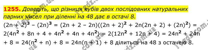 Доведіть, що різниця кубів двох послідовних натуральних парних чисел при діленні на 48 дає в остачі 8. (2n + 2)3 – (2n)3 = (2n + 2 – 2n)((2n + 2)2 + 2n(2n + 2) + (2n)2) = 2(4n2 + 8n + 4 + 4n2 + 4n + 4n2) = 2(12n2 + 12n + 4) = 24n2 + 24n + 8 = 24(n2 + n) + 8 = 24n(n + 1) + 8 ділиться на 48 з остачею 8.