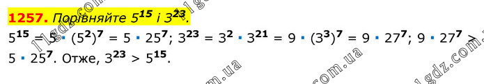 Порівняйте 515 і З23. 515 = 5 ∙ (52)7 = 5 ∙ 257; З23 = З2 ∙ З21 = 9 ∙ (З3)7 = 9 ∙ 277; 9 ∙ 277 > 5 ∙ 257. Отже, З23 > 515.
