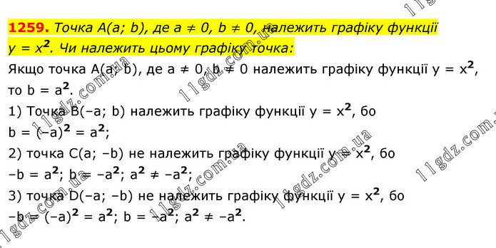 Точка А(а; b), де а ≠ 0, b ≠ 0, належить графіку функції у = х2. Чи належить цьому графіку точка: Якщо точка А(а; b), де а ≠ 0, b ≠ 0 належить графіку функції у = х2, то b = a2. 1) Точка В(–а; b) належить графіку функції у = х2, бо b = (–а)2 = а2; 2) точка С(a; –b) не належить графіку функції у = х2, бо –b = а2; b = –а2; а2 ≠ –а2; 3) точка D(–a; –b) не належить графіку функції у = х2, бо –b = (–а)2 = а2; b = –а2; а2 ≠ –а2.