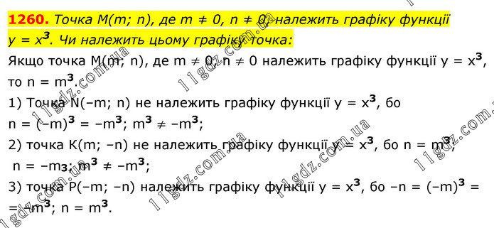 Точка М(m; n), де m ≠ 0, n ≠ 0, належить графіку функції у = х3. Чи належить цьому графіку точка: Якщо точка М(m; n), де m ≠ 0, n ≠ 0 належить графіку функції у = х3, то n = m3. 1) Точка N(–m; n) не належить графіку функції у = х3, бо n = (–m)3 = –m3; m3 ≠ –m3; 2) точка К(m; –n) не належить графіку функції у = x3, бо n = m3; n = –m3; m3 ≠ –m3; 3) точка Р(–m; –n) належить графіку функції у = х3, бо –n = (–m)3 = = –m3; n = m3.