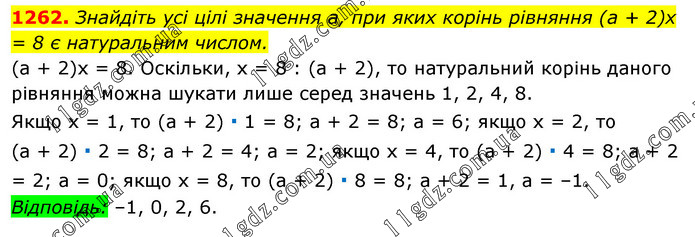 Знайдіть усі цілі значення а, при яких корінь рівняння (а + 2)х = 8 є натуральним числом. (а + 2)х = 8. Оскільки, х = 8 : (а + 2), то натуральний корінь даного рівняння можна шукати лише серед значень 1, 2, 4, 8. Якщо х = 1, то (a + 2) ∙ 1 = 8; а + 2 = 8; a = 6; якщо х = 2, то (a + 2) ∙ 2 = 8; а + 2 = 4; а = 2; якщо х = 4, то (а + 2) ∙ 4 = 8; а + 2 = 2; а = 0; якщо х = 8, то (а + 2) ∙ 8 = 8; а + 2 = 1, а = –1. Відповідь: –1, 0, 2, 6.