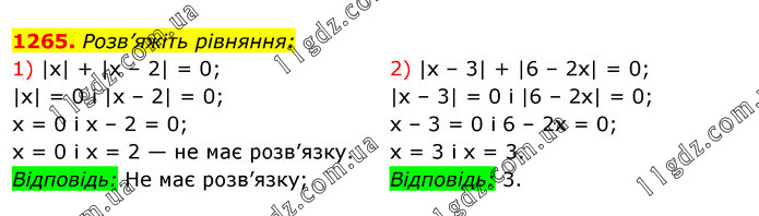 Розв’яжіть рівняння: 1) |х| + |х – 2| = 0; |х| = 0 і |х – 2| = 0; х = 0 і х – 2 = 0; х = 0 і х = 2 — не має розв’язку. Відповідь: He має розв’язку; 2) |х – 3| + |6 – 2х| = 0; |х – 3| = 0 і |6 – 2х| = 0; х – 3 = 0 і 6 – 2х = 0; х = 3 і х = 3. Відповідь: 3.