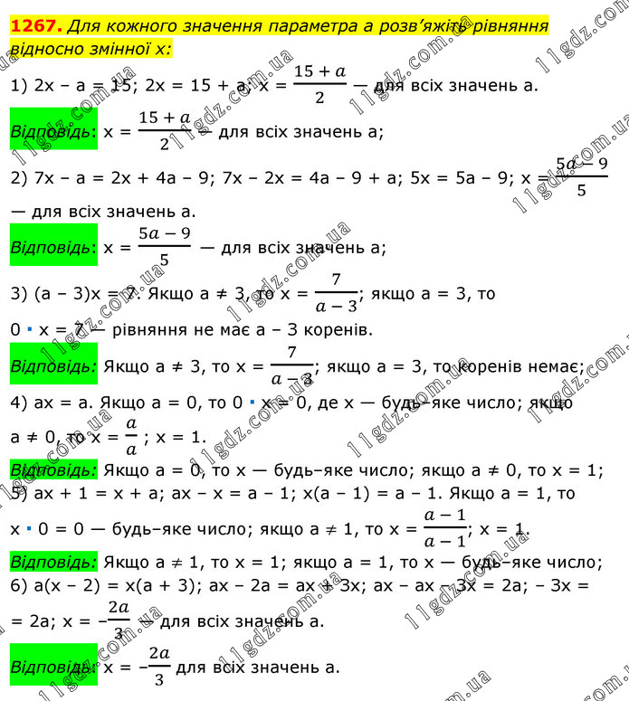 Для кожного значення параметра а розв’яжіть рівняння відносно змінної х: 1) 2х – а = 15; 2х = 15 + а; х = (15 + a)/2 — для всіх значень а. Відповідь: х = (15 + a)/2 — для всіх значень а; 2) 7х – а = 2х + 4а – 9; 7х – 2х = 4а – 9 + а; 5x = 5a – 9; x = (5a - 9)/5 — для всіх значень а. Відповідь: х = (5a - 9)/5 — для всіх значень а; 3) (а – 3)х = 7. Якщо а ≠ 3, то х = 7/(a - 3); якщо а = 3, то 0 ∙ х = 7 — рівняння не має а – З коренів. Відповідь: Якщо а ≠ 3, то х = 7/(a - 3); якщо а = 3, то коренів немає; 4) ах = а. Якщо а = 0, то 0 ∙ х = 0, де х — будь–яке число; якщо а ≠ 0, то х = a/a ; х = 1. Відповідь: Якщо а = 0, то х — будь–яке число; якщо а ≠ 0, то х = 1; 5) ах + 1 = x + а; ax – х = а – 1; х(а – 1) = а – 1. Якщо а = 1, то х ∙ 0 = 0 — будь–яке число; якщо а ≠ 1, то х = (a - 1)/(a - 1); х = 1. Відповідь: Якщо а ≠ 1, то х = 1; якщо а = 1, то х — будь–яке число; 6) а(х – 2) = х(а + 3); ах – 2а = ах + Зх; ах – ах – Зх = 2а; – Зх = = 2а; х = –2a/3 — для всіх значень а. Відповідь: х = –2a/3 для всіх значень а.