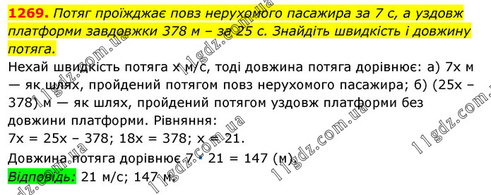 Потяг проїжджає повз нерухомого пасажира за 7 с, а уздовж платформи завдовжки 378 м – за 25 с. Знайдіть швидкість і довжину потяга. Нехай швидкість потяга х м/с, тоді довжина потяга дорівнює: а) 7х м — як шлях, пройдений потягом повз нерухомого пасажира; б) (25х – 378) м — як шлях, пройдений потягом уздовж платформи без довжини платформи. Рівняння: 7х = 25x – 378; 18х = 378; х = 21. Довжина потяга дорівнює 7 ∙ 21 = 147 (м). Відповідь: 21 м/с; 147 м.
