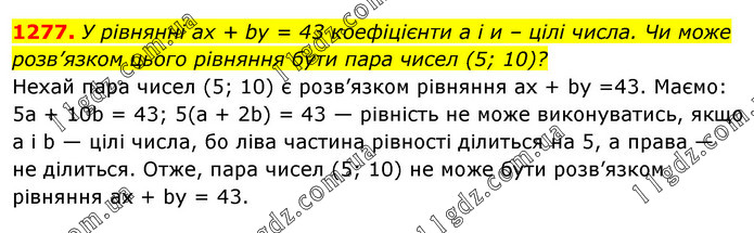 У рівнянні ах + by = 43 коефіцієнти а і и – цілі числа. Чи може розв’язком цього рівняння бути пара чисел (5; 10)? Нехай пара чисел (5; 10) є розв’язком рівняння ах + by =43. Маємо: 5a + 10b = 43; 5(а + 2b) = 43 — рівність не може виконуватись, якщо a і b — цілі числа, бо ліва частина рівності ділиться на 5, а права — не ділиться. Отже, пара чисел (5; 10) не може бути розв’язком рівняння ах + by = 43.