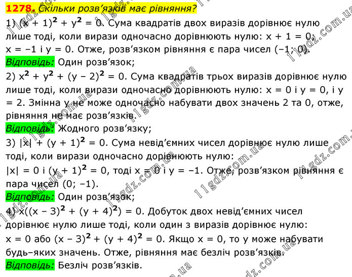 Скільки розв’язків має рівняння? 1) (х + 1)2 + y2 = 0. Сума квадратів двох виразів дорівнює нулю лише тоді, коли вирази одночасно дорівнюють нулю: х + 1 = 0; х = –1 і у = 0. Отже, розв’язком рівняння є пара чисел (–1; 0). Відповідь: Один розв’язок; 2) x2 + у2 + (у – 2)2 = 0. Сума квадратів трьох виразів дорівнює нулю лише тоді, коли вирази одночасно дорівнюють нулю: х = 0 і у = 0, i у = 2. Змінна у не може одночасно набувати двох значень 2 та 0, отже, рівняння не має розв’язків. Відповідь: Жодного розв’язку; 3) |х| + (у + 1)2 = 0. Сума невід’ємних чисел дорівнює нулю лише тоді, коли вирази одночасно дорівнюють нулю: |х| = 0 і (у + 1)2 = 0, тоді х = 0 і у = –1. Отже, розв’язком рівняння є пара чисел (0; –1). Відповідь: Один розв’язок; 4) х((х – З)2 + (у + 4)2) = 0. Добуток двох невід’ємних чисел дорівнює нулю лише тоді, коли один з виразів дорівнює нулю: х = 0 або (х – З)2 + (у + 4)2 = 0. Якщо х = 0, то у може набувати будь–яких значень. Отже, рівняння має безліч розв’язків. Відповідь: Безліч розв’язків.