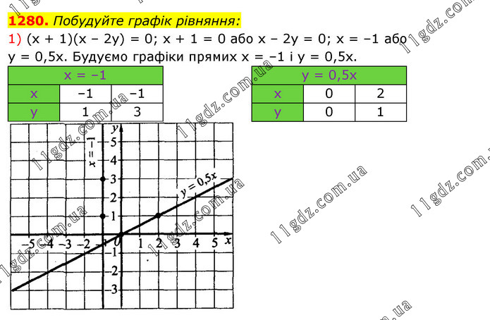 Побудуйте графік рівняння: 1) (х + 1)(х – 2у) = 0; х + 1 = 0 або х – 2у = 0; х = –1 або у = 0,5х. Будуємо графіки прямих х = –1 і у = 0,5х.