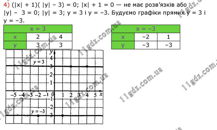 4) (|x| + 1)( |у| – 3) = 0; |x| + 1 = 0 — не має розв’язків або |у| – 3 = 0; |у| = 3; у = 3 i у = –3. Будуємо графіки прямих у = 3 і у = –3.
