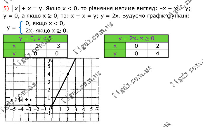 5) │х│+ х = у. Якщо х < 0, то рівняння матиме вигляд: –х + х = у; у = 0, а якщо x ≥ 0, то: x + x = y; y = 2x. Будуємо графік функції: