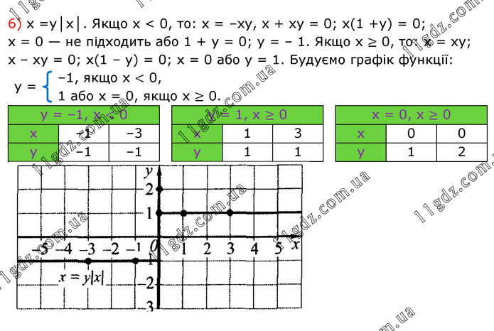 6) х =у│х│. Якщо х < 0, то: х = –ху, х + ху = 0; х(1 +у) = 0; х = 0 — не підходить або 1 + у = 0; у = – 1. Якщо х ≥ 0, то: х = ху; х – ху = 0; х(1 – у) = 0; х = 0 або у = 1. Будуємо графік функції: