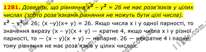 Доведіть, що рівняння х2 – у2 = 26 не має розв’язків у цілих числах (тобто розв’язками рівняння не можуть бути цілі числа). x2 – у2 = 26; (х –у)(х+ у) = 26. Якщо числа х і у одної парності, то значення виразу (х – у)(x + у) — кратне 4, якщо числа x і у різної парності, то — (х – у)(х + у) — непарне. 26 — некратне 4 і парне, тому рівняння не має розв’язків у цілих числах.