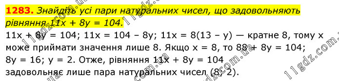 Знайдіть усі пари натуральних чисел, що задовольняють рівняння 11x + 8у = 104. 11x + 8y = 104; 11x = 104 – 8у; 11x = 8(13 – у) — кратне 8, тому х може приймати значення лише 8. Якщо х = 8, то 88 + 8у = 104; 8у = 16; у = 2. Отже, рівняння 11x + 8у = 104 задовольняє лише пара натуральних чисел (8; 2).