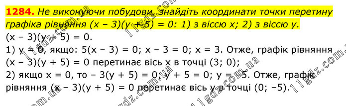 He виконуючи побудови, знайдіть координати точки перетину графіка рівняння (x – 3)(у + 5) = 0: 1) з віссю х; 2) з віссю у. (х – 3)(у + 5) = 0. 1) у = 0, якщо: 5(х – 3) = 0; х – 3 = 0; х = 3. Отже, графік рівняння (х – 3)(у + 5) = 0 перетинає вісь х в точці (3; 0); 2) якщо х = 0, то – 3(у + 5) = 0; у + 5 = 0; у = –5. Отже, графік рівняння (х – 3)(у + 5) = 0 перетинає вісь у в точці (0; –5).