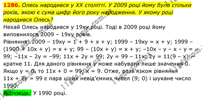 Олесь народився у XX столітті. У 2009 році йому було стільки років, якою є сума цифр його року народження. У якому році народився Олесь? Нехай Олесь народився у 19ху році. Тоді в 2009 році йому виповнилося 2009 – 19xу років. Рівняння: 2009 – 19ху = 1 + 9 + х + у; 1999 – 19ху = х + у; 1999 – (1900 + 10x + у) = х + у; 99 – (10х + у) = х + у; –10х – у – х – у = –99; –11х – 2у = –99; 11х + 2у = 99; 2у = 99 – 11x; 2у = 11(9 – х) — кратне 11. Для даного рівняння у може набувати лише значення 0. Якщо у = 0, то 11x + 0 = 99; х = 9. Отже, розв’язком рівняння 11x + 2у = 99 є пара цілих невід’ємних чисел (9; 0) і шукане число 1990. Відповідь: У 1990 році.