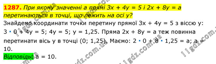 При якому значенні а прямі Зх + 4у = 5 і 2х + 8у = а перетинаються в точці, що лежить на осі у? Знайдемо координати точки перетину прямої Зх + 4у = 5 з віссю у: 3 ∙ 0 + 4у = 5; 4у = 5; у = 1,25. Пряма 2х + 8y = а теж повинна перетинати вісь у в точці (0; 1,25). Маємо: 2 ∙ 0 + 8 ∙ 1,25 = а; а = 10. Відповідь: а = 10.