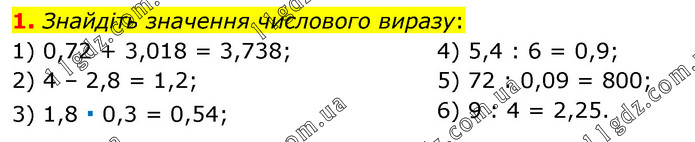 Знайдіть значення числового виразу: 1) 0,72 + 3,018 = 3,738; 2) 4 – 2,8 = 1,2; 3) 1,8 ∙ 0,3 = 0,54; 4) 5,4 : 6 = 0,9; 5) 72 : 0,09 = 800; 6) 9 : 4 = 2,25.