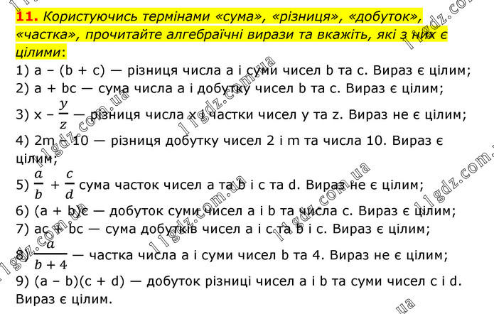 Користуючись термінами «сума», «різниця», «добуток», «частка», прочитайте алгебраїчні вирази та вкажіть, які з них є цілими: 1) а – (b + с) — різниця числа а і суми чисел b та с. Вираз є цілим; 2) а + bс — сума числа а і добутку чисел b та с. Вираз є цілим; 3) х – y/z — різниця числа х і частки чисел у та z. Вираз не є цілим; 4) 2m – 10 — різниця добутку чисел 2 і m та числа 10. Вираз є цілим; 5) a/b + c/d сума часток чисел а та b і с та d. Вираз не є цілим; 6) (а + b)с — добуток суми чисел а і b та числа с. Вираз є цілим; 7) ас + bс — сума добутків чисел а і с та b і с. Вираз є цілим; 8) a/(b + 4) — частка числа а і суми чисел b та 4. Вираз не є цілим; 9) (а – b)(с + d) — добуток різниці чисел а і b та суми чисел с і d. Вираз є цілим.