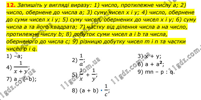 Запишіть у вигляді виразу: 1) число, протилежне числу a; 2) число, обернене до числа a; 3) суму чисел x і y; 4) число, обернене до суми чисел x і y; 5) суму чисел, обернених до чисел x і y; 6) суму числа a та його квадрата; 7) частку від ділення числа a на число, протилежне числу b; 8) добуток суми чисел a і b та числа, оберненого до числа c; 9) різницю добутку чисел m і n та частки чисел p і q. 1) –a; 4) 1/(x + y); 7) a : (–b); 2) 1/a; 5) 1/x + 1/y; 8) (a + b) ∙ 1/c; 3) x + y; 6) a + a2; 9) mn – p : q.