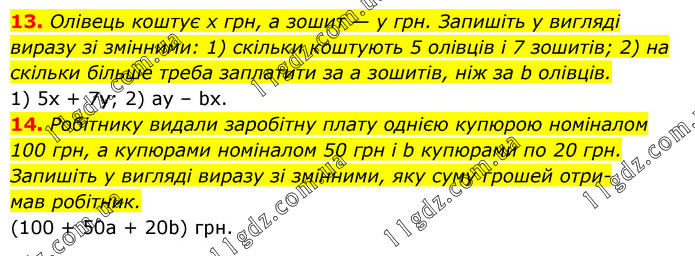 13. Олівець коштує x грн, а зошит — y грн. Запишіть у вигляді виразу зі змінними: 1) скільки коштують 5 олівців і 7 зошитів; 2) на скільки більше треба заплатити за a зошитів, ніж за b олівців. 1) 5x + 7у; 2) ау – bх. 14. Робітнику видали заробітну плату однією купюрою номіналом 100 грн, a купюрами номіналом 50 грн і b купюрами по 20 грн. Запишіть у вигляді виразу зі змінними, яку суму грошей отри- мав робітник. (100 + 50а + 20b) грн.
