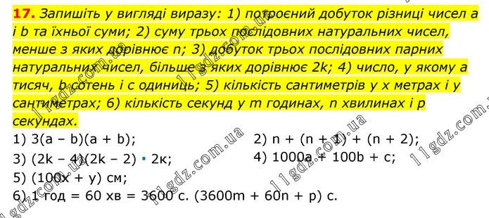 Запишіть у вигляді виразу: 1) потроєний добуток різниці чисел a і b та їхньої суми; 2) суму трьох послідовних натуральних чисел, менше з яких дорівнює n; 3) добуток трьох послідовних парних натуральних чисел, більше з яких дорівнює 2k; 4) число, у якому a тисяч, b сотень і c одиниць; 5) кількість сантиметрів у x метрах і y сантиметрах; 6) кількість секунд у m годинах, n хвилинах і p секундах. 1) 3(a – b)(а + b); 3) (2k – 4)(2k – 2) ∙ 2к; 5) (100x + y) см; 2) n + (n + 1) + (n + 2); 4) 1000а + 100b + с; 6) 1 год = 60 хв = 3600 с. (3600m + 60n + р) с.