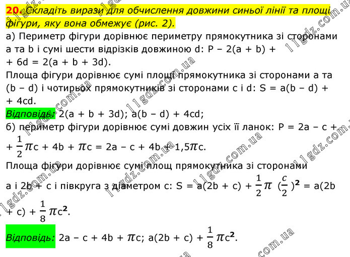 Складіть вирази для обчислення довжини синьої лінії та площі фігури, яку вона обмежує (рис. 2). а) Периметр фігури дорівнює периметру прямокутника зі сторонами а та b і сумі шести відрізків довжиною d: P – 2(а + b) + + 6d = 2(а + b + 3d). Площа фігури дорівнює сумі площі прямокутника зі сторонами а та (b – d) і чотирьох прямокутників зі сторонами с і d: S = a(b – d) + + 4cd. Відповідь: 2(а + b + 3d); a(b – d) + 4cd; б) периметр фігури дорівнює сумі довжин усіх її ланок: Р = 2а – с + + 1/2 πс + 4b + πс = 2а – с + 4b + 1,5πс. Площа фігури дорівнює сумі площ прямокутника зі сторонами а і 2b + с і півкруга з діаметром с: S = а(2b + с) + 1/2 π (c/2 )2 = а(2b + с) + 1/8 πс2. Відповідь: 2а – с + 4b + πс; а(2b + с) + 1/8 πс2.